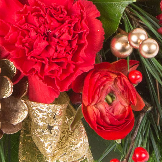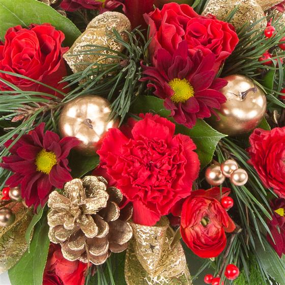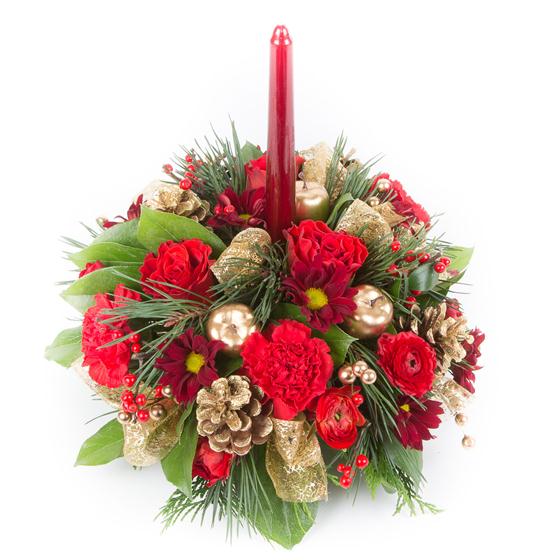 This traditional favourite is full of seasonal joy. Finished with a candle in the centre, this beautiful arrangement is perfect for a table centrepiece.