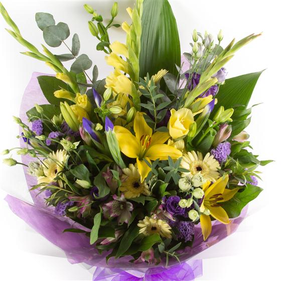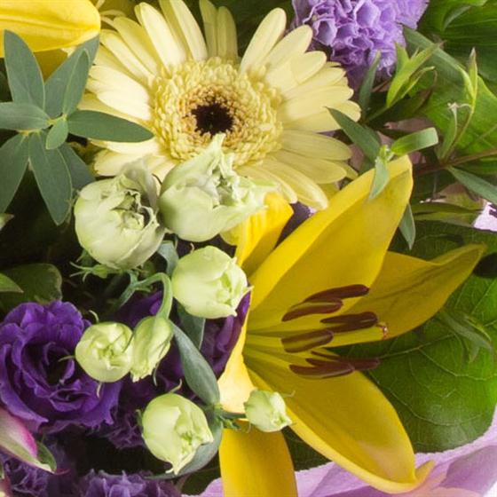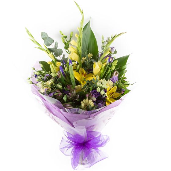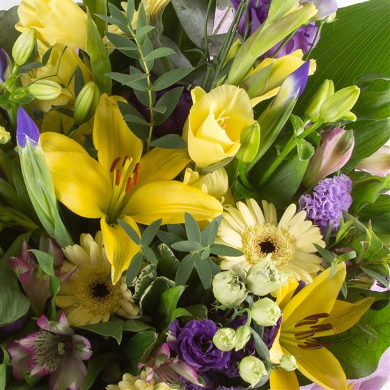 A hand-tied bouquet of seasonal lilac, purple, yellow & lemon blooms with fresh foliage, finished with a complementary wrap. Delivered in a box containing water, this bouquet can be left as it is to enjoy for minimal maintenance.