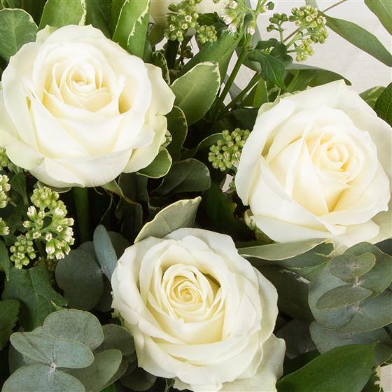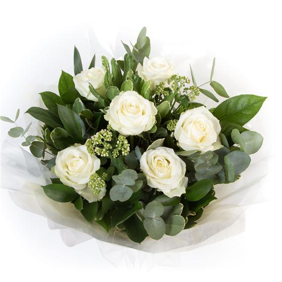 Six perfect white roses mingled with mixed seasonal foliage. Delivered in a box containing water, this bouquet can be left as it is to enjoy for minimal maintenance.