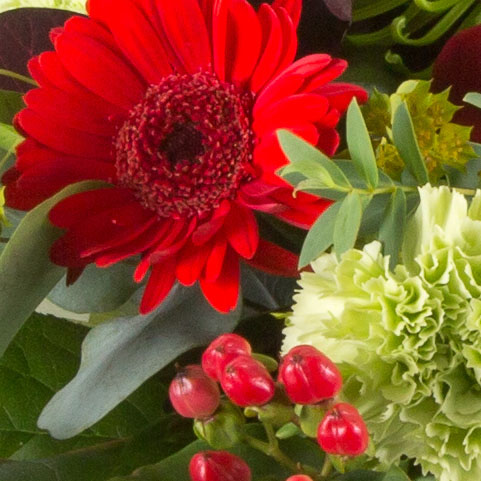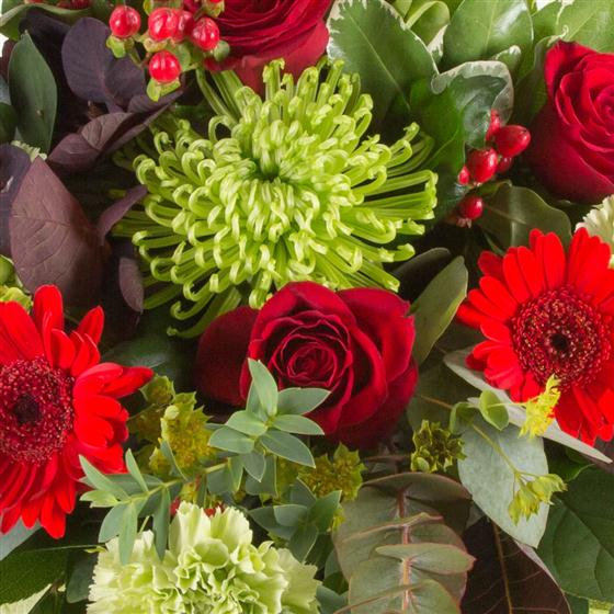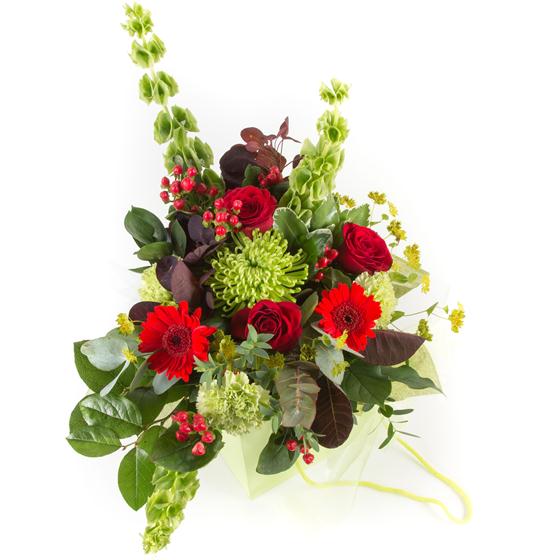 An unusual, vibrant gift bag of seasonal lime & red blooms mixed with foliage. Delivered in a gift bag containing water, this bouquet can be left as it is to enjoy for minimal maintenance.