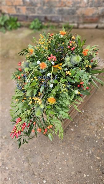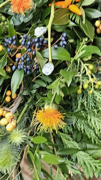 A beautifully natural choice. This single ended spray is lovingly made with a mixture of fresh seasonal foliage along with berries and thistles.
