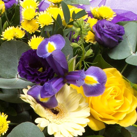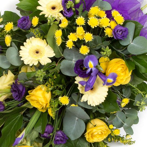 A popular, colourful tribute of seasonal purple, lilac, yellow & lemon flowers with complementing foliage.