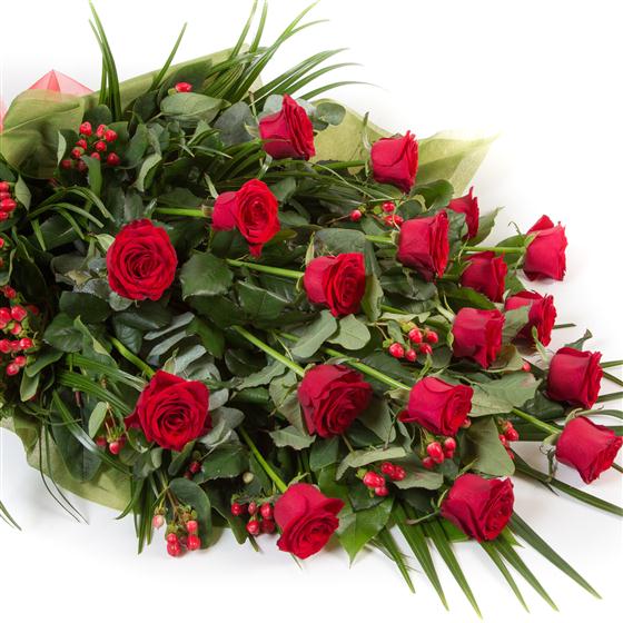 Long stemmed roses and mixed seasonal foliage combine to make an elegant, classic tribute. Tied simply with a complementary bow. Available in a range of colours.