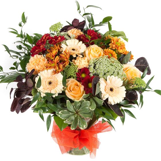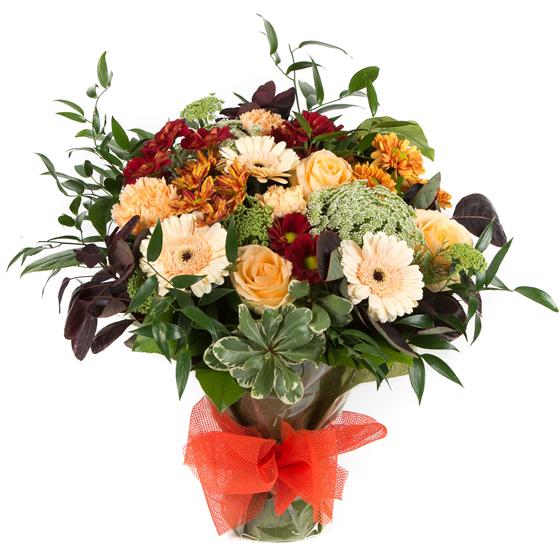Peaches, rusts and reds combine with autumnal foliage to create this timeless hand-tied bouquet. Delivered in a box containing water, this bouquet can be left as it is to enjoy for minimal maintenance.